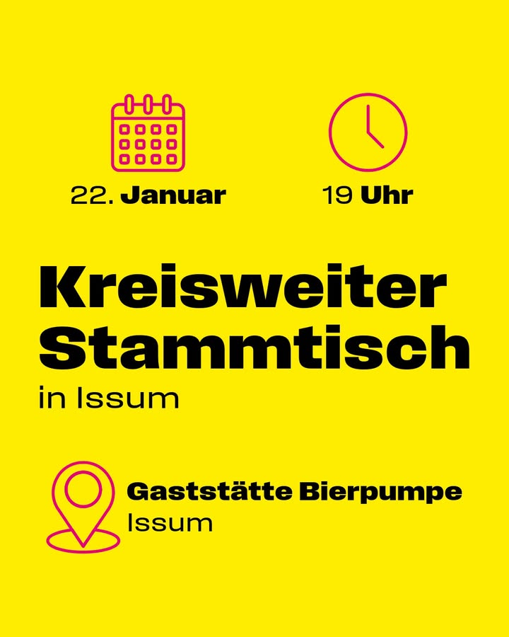 In der nächsten Woche ist es wieder soweit: Unsere kreisweiten Stammtische starten in das neue Jahr, diesmal sind wir in Issum zu Gast! 🤝 Herzlich laden wir euch hiermit zum nächsten Stammtisch unseres Kreisverbandes ein! Lernt unsere Mitglieder kennen, tauscht euch über politische Themen aus und diskutiert eure Fragen und Anliegen mit uns – ganz ohne Tagesordnung, aber mit viel Raum für Ideen und Fragen! 📍 Gaststätte "Bierpumpe", Kapellener Straße 136, 47661 Issum 🗓️ 22. Januar 2026 🕢 Ab 19:00 Uhr Wir freuen uns auf euren Besuch und spannende Gespräche in geselliger Runde!